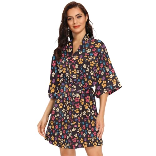 FRODOTGV Söta tassar tryck tonhöjd svarta kvinnor kimono morgonrockar, morgonrock nattlinne mjuk nattskjorta ledig, Söta tassar tryck tonhöjd svart, S