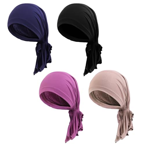 XEPST 4-pack kemo-huvudbonader för kvinnor, förbunden bandana muslimsk mössa turban huvudscarf för kemo håravfall cancer patienter sömnmössor, Lila, svart, kaki, mörkblå, one size