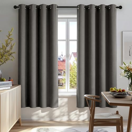 Easy-Going Mörkläggningsgardiner, enfärgad värmeisolerande och brudreducerande fönstergardin med öljetter, mörkläggningsgardiner för vardagsrum och sovrum, 2 längder (132 x 160 cm, grå)