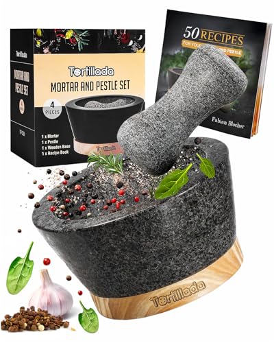 Tortillada – 15 cm mortel och mortelstöt set stor tillverkad av naturlig granit med repfri träbas granit krydda örtkvarn pillerkrossare med 50 recept, svart