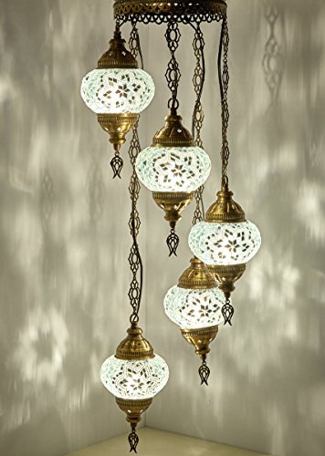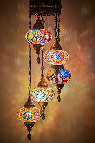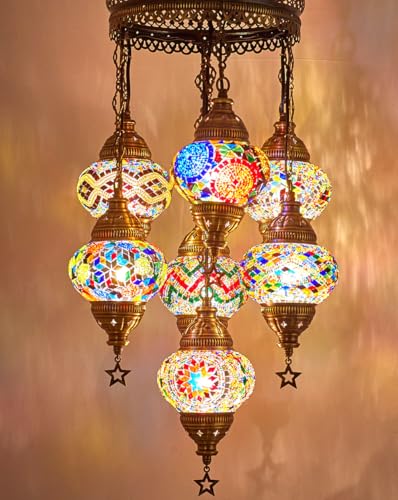 DEMMEX Ljuskrona i turkisk marockansk mosaik – handgjord hängande taklampa och ljusarmatur med anpassningsbara glober – boho hantverksbelysning för vardagsrum och sovrum
