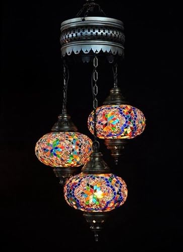 DEMMEX 3-glob turkisk mosaik hård trådbunden ljuskrona, handgjord marockansk hängande taklampa, bohemisk dekorativ pendellampa för vardagsrum, sovrum, 1,1 m, anpassningsbar