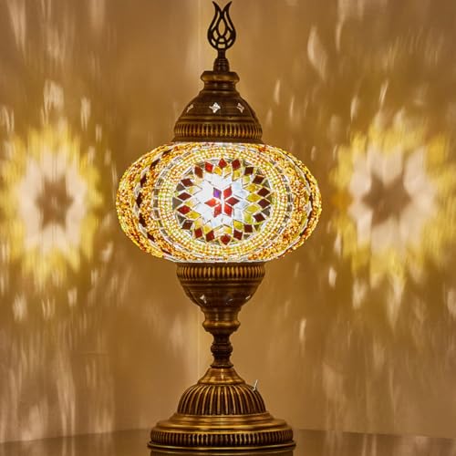 DEMMEX Batteridriven mosaikbord med inbyggd LED-lampa, turkisk marockansk handgjord mosaikbord skrivbord sängbord humör accent nattlampa lampskärm med LED-lampa, ingen sladd (bärnsten)
