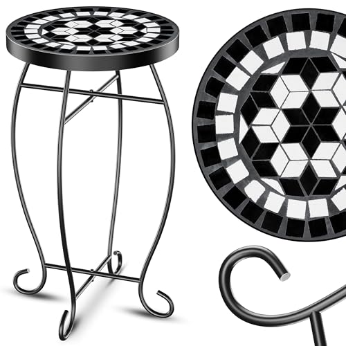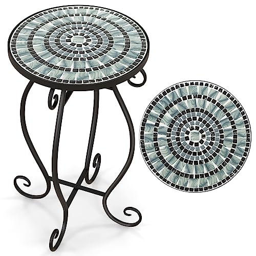 COSTWAY Sidobord, mosaikbord, rund, mosaik, trädgårdsbord, bistrobord, Ø 30 x 50 cm, balkongbord av metall och keramik, blompall för balkong, terrass, trädgård (svart + grå)