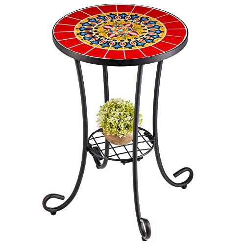 VONLUCE Mosaik, sidobord, runt retro, mosaikbord, metallbord, kaffebord, 35,5 x 54,5 cm, blompall, blomställ, växtstativ, blomhylla med mosaikplatta, 30 cm (röd)