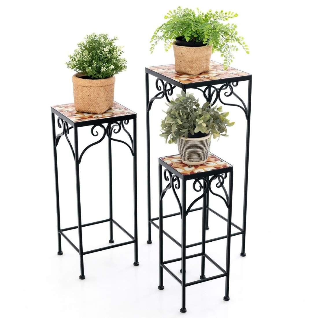 Set med 3 växtställ i metall med mosaikplattor infästbara planteringskärl blå 28/23/18cm