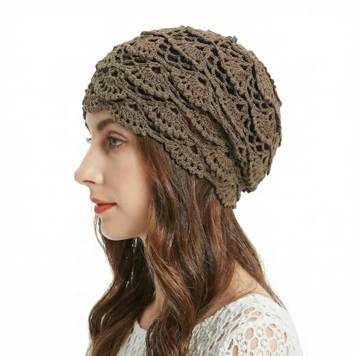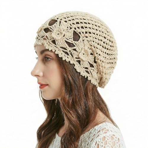 ZLYC Dam, bomull, virkad lös mössa, handgjord, stickad, sommar, skalle, stickad Beige, one size