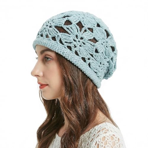 ZLYC Dam bomull virkad slouchy mössa hatt handgjord stickad sommar skalle keps, Solid mild blå, one size
