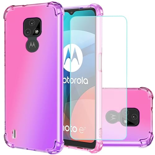 Jhxtech för Moto E7 fodral, Motorola E7 fodral med [2-pack] skärmskydd i härdat glas, klart gradient fodral smalt reptåligt TPU-skydd stöttåligt skyddsfodral för Motorola Moto E7 (rosa/lila)