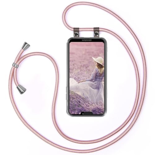 moex Mobiltelefonkedja kompatibel med Motorola Moto G7 Power fodral med band, justerbar längd, mobiltelefonfodral för upphängning, silikonfodral, transparent med snöre, avtagbar i roséguld