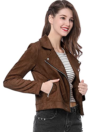 Allegra K Women's Short Soft Zip Up Faux Suede Biker Moto Jacket Medium Brown