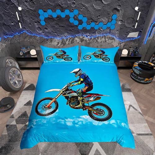 Loussiesd 3D motocross racer påslakanset dirtbike extremsport sängkläder set för barn pojkar män tävling motorcykel täcke skydd blå himmel påslakan sovrum samling 2 st enkel storlek