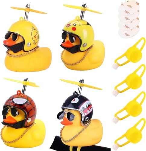 HESUSUSI gul anka cykel ornament, 4 stycken gummianka leksak gummi gul anka bil prydnad anka med propeller motorcykel med propellerhjälm och fästband för bil cykel hus dekoration