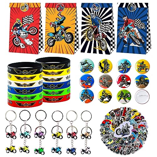 98 st motorcykel party present, Dirt Bike Party tillbehör, Dirt Bike födelsedagsfest-tillbehör, motorcykel födelsedag presentpåsar armband märke nyckelring klistermärken
