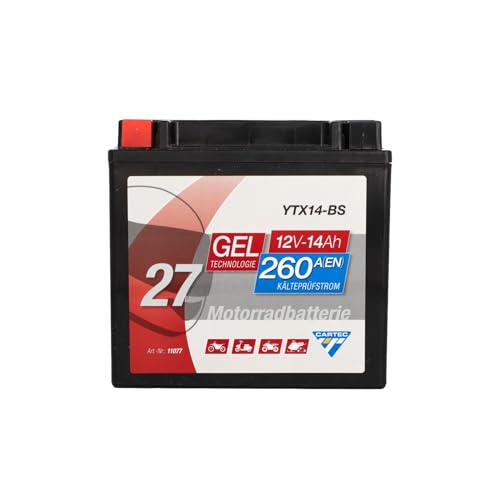 CARTEC motorcykelbatteri YTX14-BS, 14Ah, 260A, gelteknik motorcykel startbatteri, OEM-kvalitet, cykelsäker, lagrbar, underhållsfri, svart
