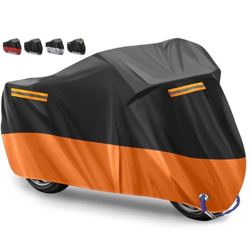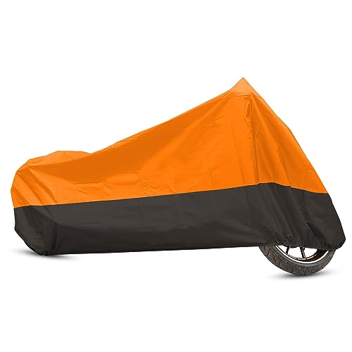 XYZCTEM Motorcykelskydd – vattentätt utomhusskydd för alla årstider – exakt passform upp till 91 tum turcyklar, hackare och cruisers – skyddar mot damm, skräp, regn och väder (L,svart och orange)