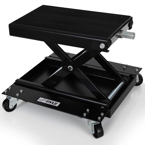 Pyle Motorlyft med Sax och Dolly Bärbar EZ Rack för Cyklar, Däckstöd och Motor Fram, Center och Bak med Hjul, Manuell Lågprofil Lyftbord för Cruiser, Crossmotorcyklar