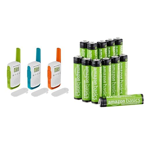 Motorola 5031753007515 Talkabout 2-Vägs Walkie Talkie Bärbar Radio, Orange/Grön/Blå, Paket med 3 & AmazonBasics AAA Återuppladdningsbara Batterier, Paket med 12