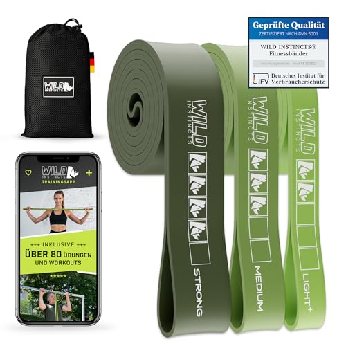 Wild Instincts Set med 3 dragband (Light+, medium, stark) träningsband set/band för pull-up/motståndsband set/motståndsband för crossfit och stretching + väska + träning webbapp