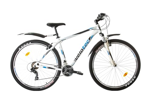 Multibrand Velotec PRO 29 tum Mountainbike i aluminium, 21 växlar, V-broms, unisex, lämplig för 175–190 cm (Vit med blå och svart)