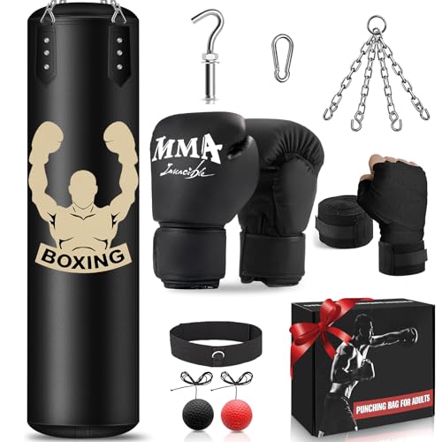 JUOIFIP Tung boxningssäck hängande set, ofylld 4FT boxningsväska med handskar och ett komplett utbud av tillbehör, mikrofiber läder tung väska för träning kickboxning fitness MMA brottning muay thai