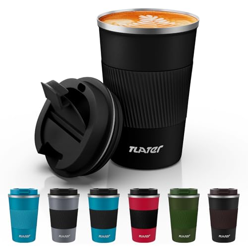 Tlater Kaffemugg to go, 380 ml termosmugg – isolerad mugg med läckagesäkert lock, vakuumisolerad, dubbelväggad resemugg i rostfritt stål, för kaffe och te (svart)