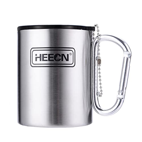 HEECN Karbinhake mugg med lock - campingmuggar för varma drycker - vandringskopp - kaffekoppar i rostfritt stål - 330 ml med förseglat dricklock