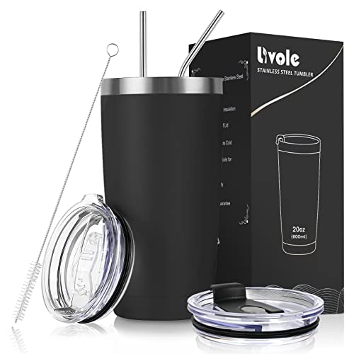 Livole Termosmugg på 600 ml för män och kvinnor, bilmugg, kaffemugg att ta med, rostfri mugg med sugrör och lock, dubbelväggig dryckesmugg med vakuum, campingmugg, svart