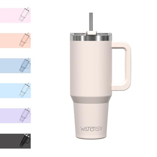 WATERSY 891 ml isolerad mugg med sugrör och handtag, 30 oz dubbelt rostfritt stål beige isolerad resemugg läckagesäker kaffemugg att ta med, för bil, kontor, resor
