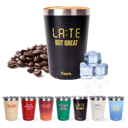 Fisura – Termomugg original "Late but great". Termomugg för kaffe att ta med, svart. Kaffekopp 310 ml. Termisk mugg i rostfritt stål. BPA-fri. Bilbägare.