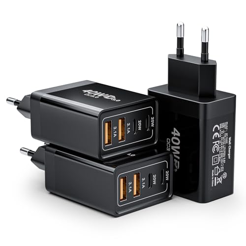 3-Pack USB C-Laddare, 40W 4-Portars Multiladdare med USB-C och USB-A, Snabbladdare PD 3.0 Strömadapter USB-Strömförsörjningskontakt för Phone 16/15/14/13/12/11/Pro Max/XS/XR, iPad Samsung Galaxy