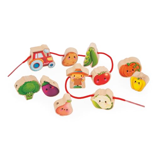Janod -LA Ferme trä-multisensorisk trädgårdstema-11 barnpärlor + 2 snodd-stimulerande handtag träleksak FSC-från 24 månader, J03313, flerfärgad