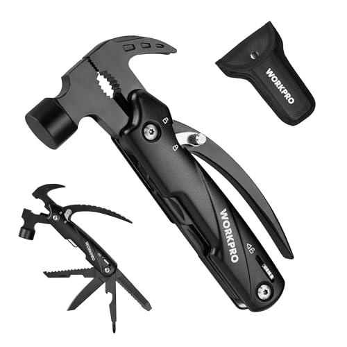 Workpro Multiverktyg hammare 12-i-1 multiverktyg verktyg camping hammare multifunktionsverktyg med hammare, fällkniv, nagelborttagare, tång, såg, bits, presenter till semester med bärväska