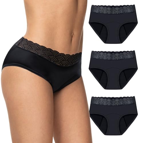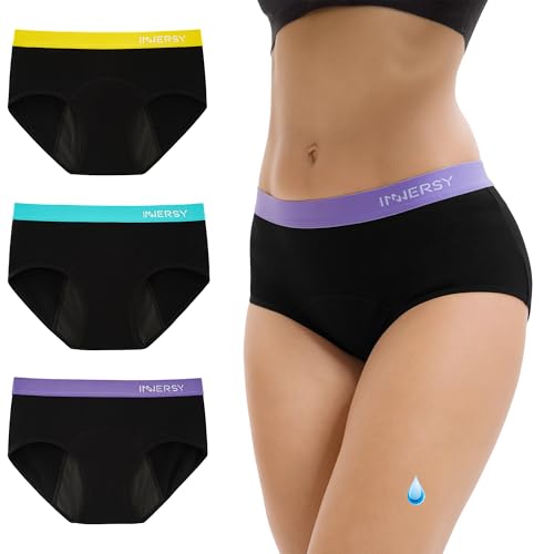 INNERSY Underkläder för menstruationscykel, dam, tvättbara menstruationstrosor, svart, underkläder, medelhög midja, 3-pack (M, 3 svart)