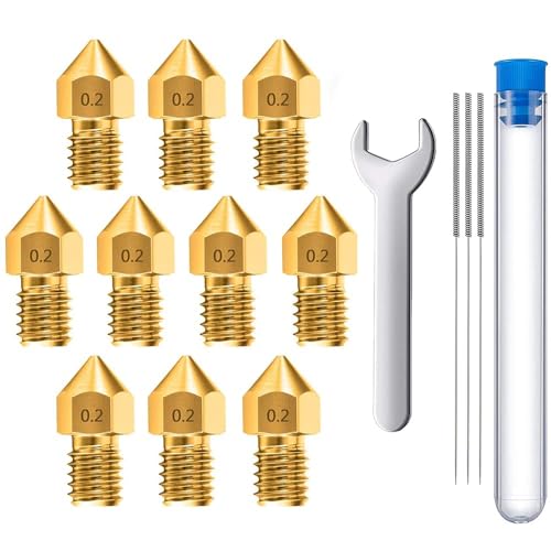 MMOBIEL Paket med 10 st 3D-skrivare munstycke extrudrar 0,2 mm mässing MK8 kompatibel med Creality Series Ender 3 Ender 5 CR-10/10S Makerbot Inkluderar 3 rengöringsnålar och skiftnyckel