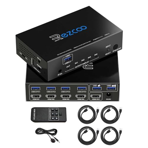 USB KVM-omkopplare med 4 portar USB 3.0 4-i-4 ut SPDIF 5.1 ljudbrytning – mus/tangentbord/trådlös USB för PC, skrivare, skanner, fönster, Linux, 4K 60Hz HDR HDMI Auto Switch 4x1, IR fjärrkontroll KVM 4X1