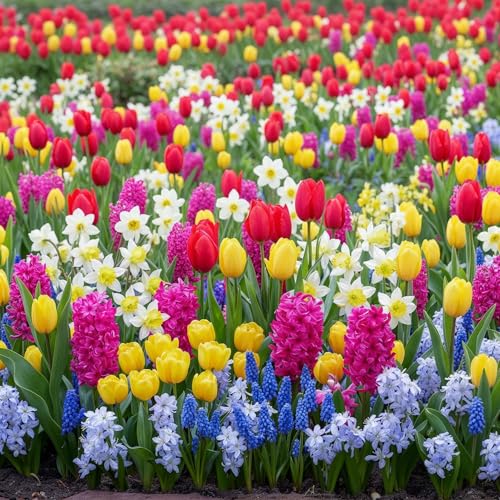 Spring Border blomlökar samling (50 lökar) exklusiv blandning från Holland, tålig och perenn för trädgård, krukor (stora lökar, inga frön, inte konstgjorda) tulpaner-narcissus-hyachinths-muscari