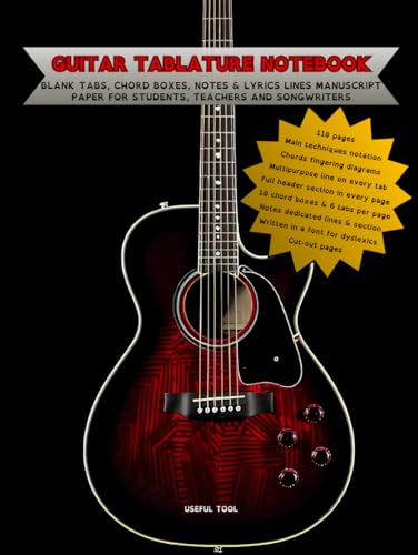 Guitar Tab Notebook Manuscript Paper Organized for Music Notation and Chord Diagrams for Dyslexics: Blank Tabs, Chord Boxes, Notes & Lyrics Lines ... Blank Sheets. Techniques Notation. 110 Pages.