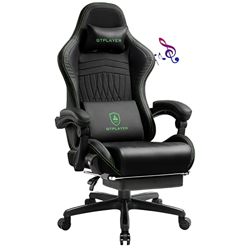 GTPLAYER Spelstol, ergonomisk, spelstol, spelstol, med fotstöd, högtalare, musik, maximal belastning 150 kg, svart/grön