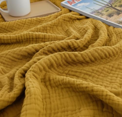 KyraHome100% ekologisk bomull 140 x 152 cm muslin filt för soffa vuxna, förtvättad växt och handfärgad andningsbar mjuk, mysig, lätt sommarfilt med lugg, hela säsongen (morgongul)