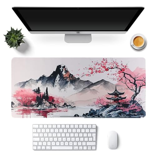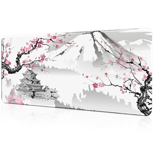 Yimomoyi Musmatta Med Körsbärsblom, 900 x 400 x 3 mm Utökad Stor Musmatta/Skrivbordsunderlägg, Musmatta Med Sydda Kanter, Halkfri Gummibas,Tangentbordsunderlägg (Färgad Gård)