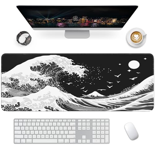 JIALONG XXL Speed gaming-musmatta svart 900 x 400 mm – XXL musmatta – havsvåg skrivbordsunderlägg vattentät halkfri musmatta för dator, PC och bärbar dator