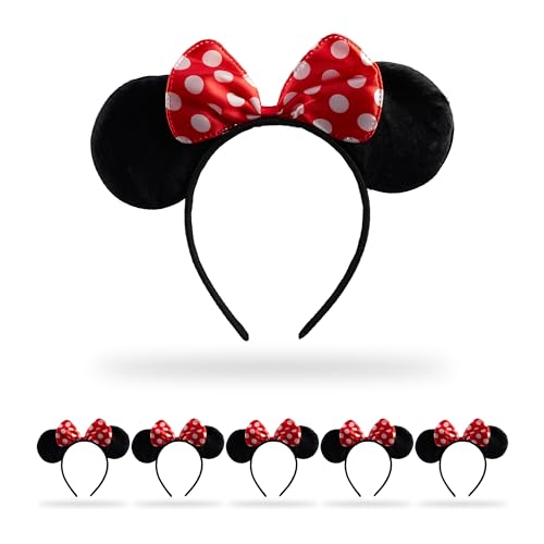 Relaxdays Hårband, set om 6, musöron och prickad rosett, öronhår, huvudbonad mus kostym, svart/röd