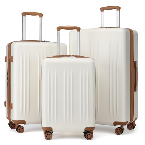 Kono Expanderbar resväska ABS & PC hårt skal medium resväska 4 hjul lätt 20 54 78 cm enkel/set med 3, Kräm vit/brun, Set of 3(20/24/28 Inch), Bagageset