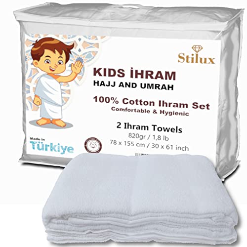 Stilux Barn deras Ehram Ahram Set för Hajj och Umrah 820gr | 2 vita handdukar 78 x 155 cm | 100 % naturlig bomull | hygienisk, bekväm och snabbtorkande