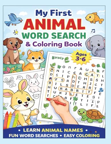 My First Animal Word Search & Coloring Book: Fun and Easy Animal Puzzles and Coloring Pages for Kids Ages 3–6 | Preschool & Kindergarten Learning Activity Boo