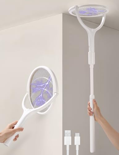 Elektrisk flugsmälla, roterande huvud, uppladdningsbar elektrisk flugfälla, myggfälla, fruktflugfälla, insektsborttagare, flugfångare, med teleskop, förlängningsstång, vit
