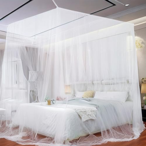 Vpory Canopy sänggardiner – 4 hörnstolpar sänghimmel gardiner för flickor och vuxna, säng prinsessa säng baldakin myggnät sovrum dekorationstillbehör – vit, full storlek/drottning storlek