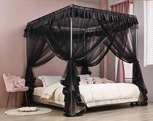 VETHIN 4 hörn stolpe volang prinsessa säng baldakin gardin – dubbelskikt mysigt draperingsnät 4 öppningar myggnät för flickor vuxna sovrumsdekoration (dubbelsvart, 162 cm B x 208 cm L x 208 cm x