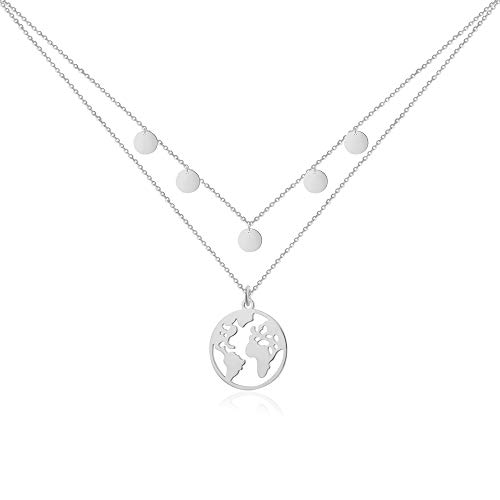 Globe halsband i Silver med plattor Multi-row för damer - vattentät I Layering halsband med världskarta och mynt I World Travel Double Chain